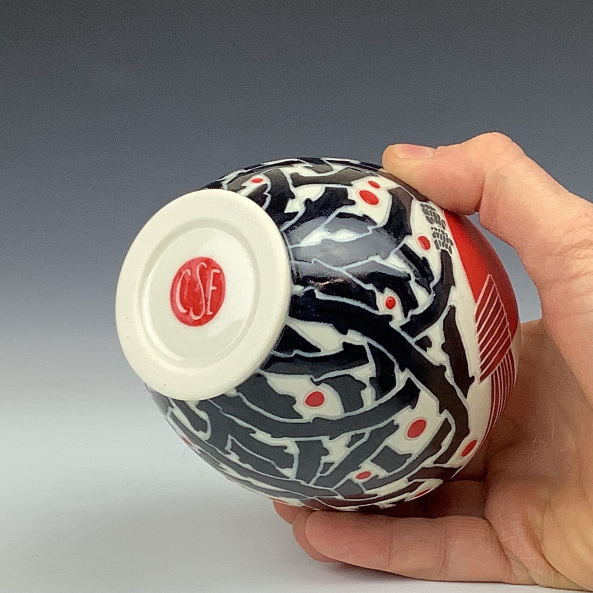 4 3/4"H x 3 1/2"W wheel-thrown porcelain, underglaze, glaze